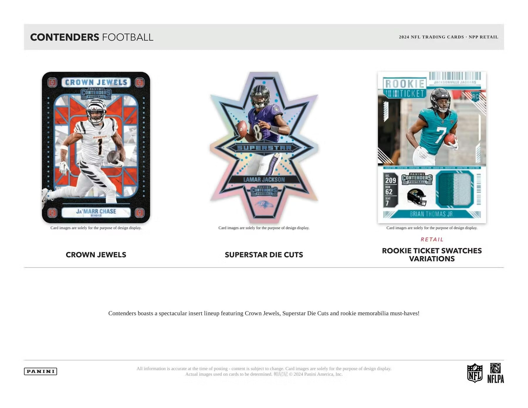 - The juggernaut that is Contenders Football returns for the 2024 season, boasting its trademark arsenal of collection-making content headlined by Rookie Ticket autographs, a spectacular array of parallels, must-have inserts and so much more.