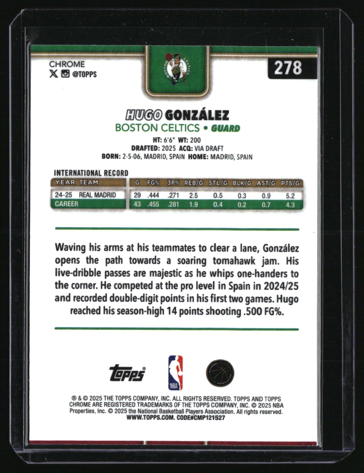 This is a nice example of a 2025-26 Topps Chrome #278 Hugo González Red White and Blue Refractor Other important information about this card:Red White & BlueRCIn 2025 Hugo González played for the Boston Celtics.Please check out our other listings for more great cards.