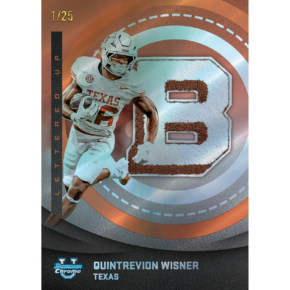 2025 Bowman University Chrome® Football storms back onto the field with a stacked checklist, fresh inserts, and the first Chrome® cards of tomorrow's gridiron greats. From powerhouse programs to rising schools, this release captures the energy of college football's most exciting names. Every card in the 200-card base set pops with Chrome finish and school spirit, giving fans a first look at top prospects before they hit the pro stage. Whether you're chasing a future first-rounder or collecting your alma mater, every pull feels personal.