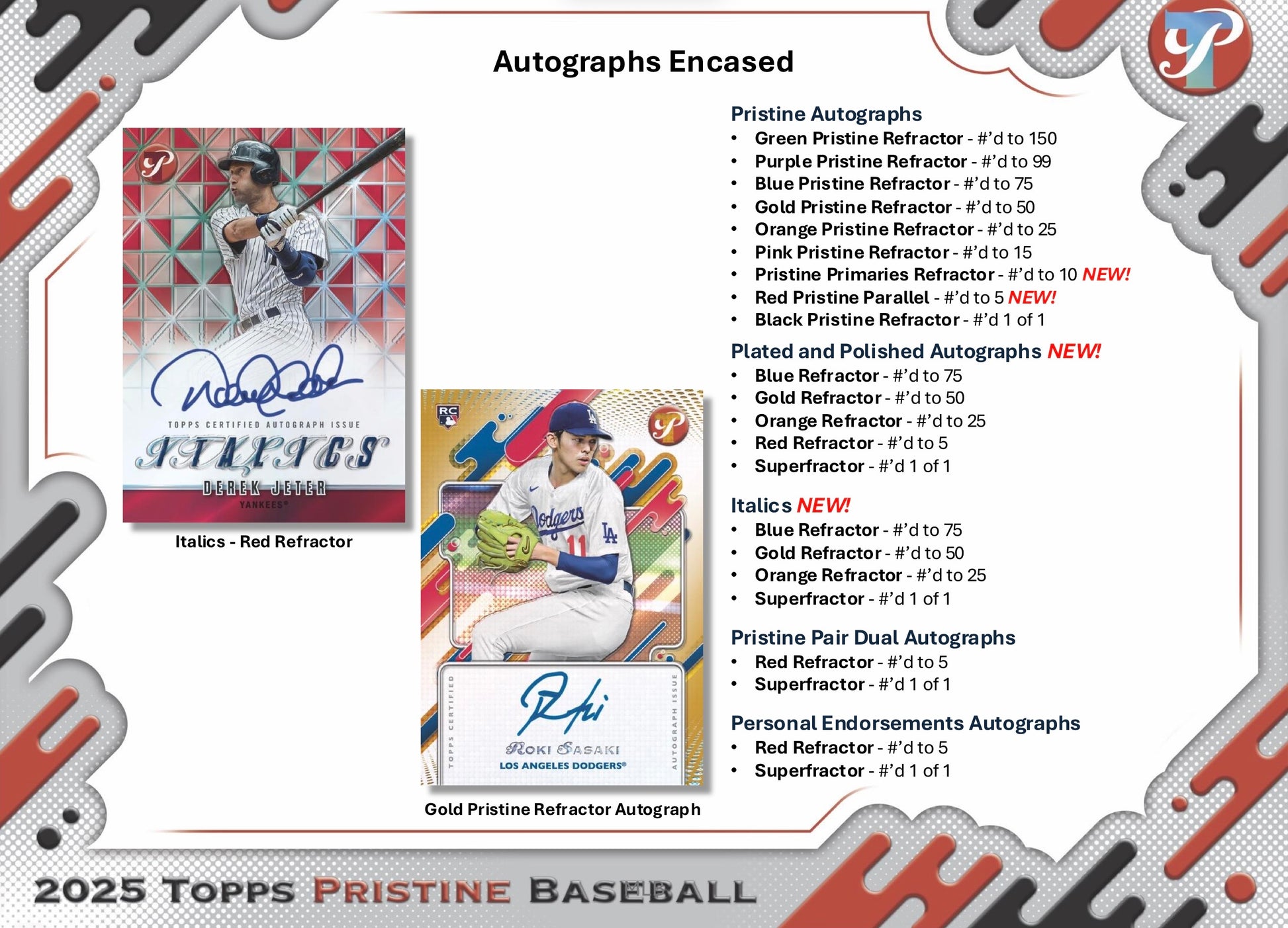 - Autographs remain a centerpiece with encased on-card Pristine Autographs in a full run of colored refractors, plus new Plated & Polished Autographs and Italics!