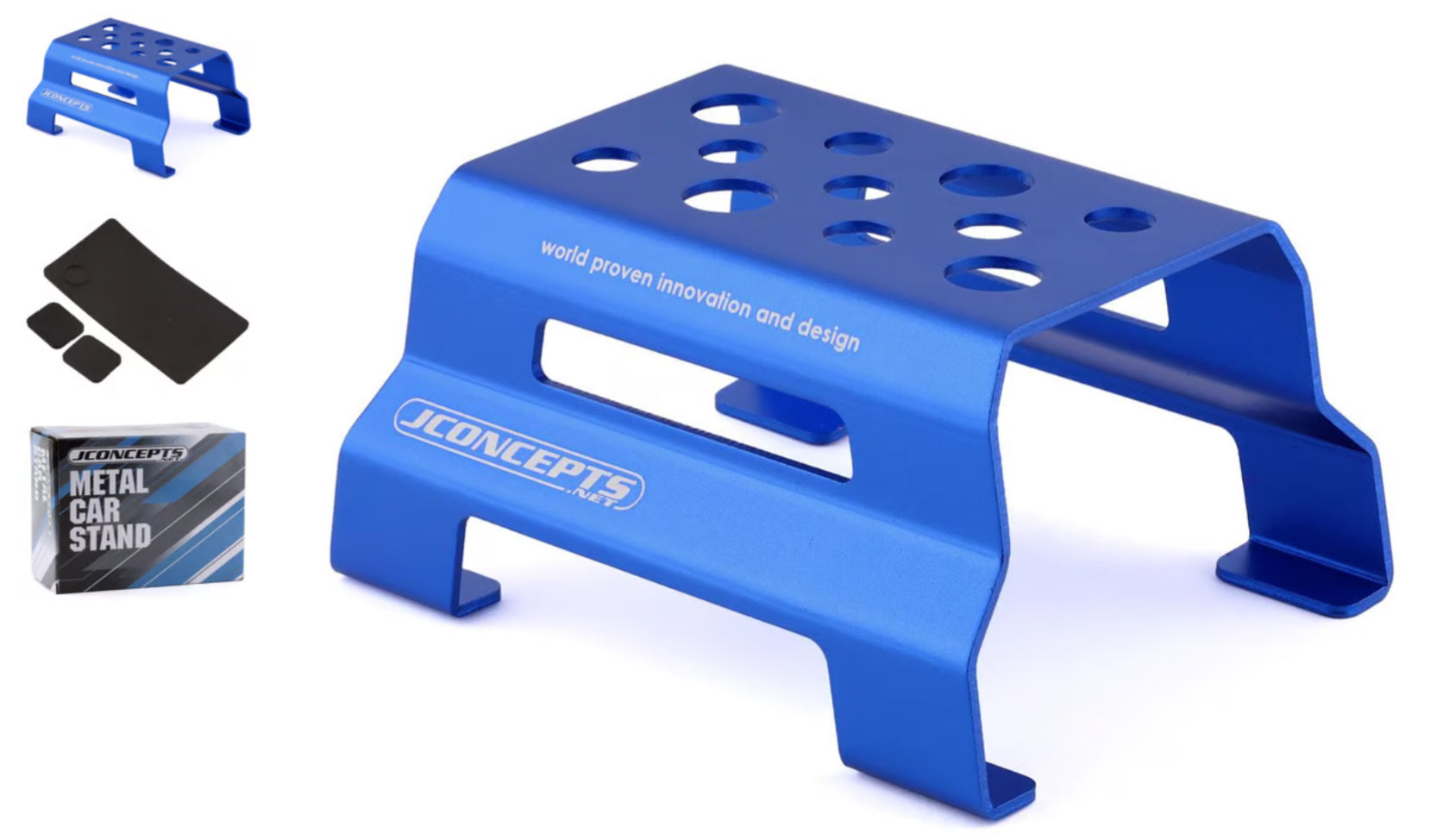 The JConcepts Metal Car Stand is perfect for the 1/8th or 1/10th racer looking to add a little sturdiness to their racing program. The all-aluminum formed and cut piece, designed by JConcepts, has a unique shape, cut-outs for handles and features laser etched logos for identification. The item stands tall and keeps the wheels off the ground for an array of vehicles.