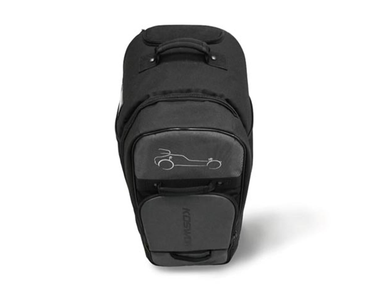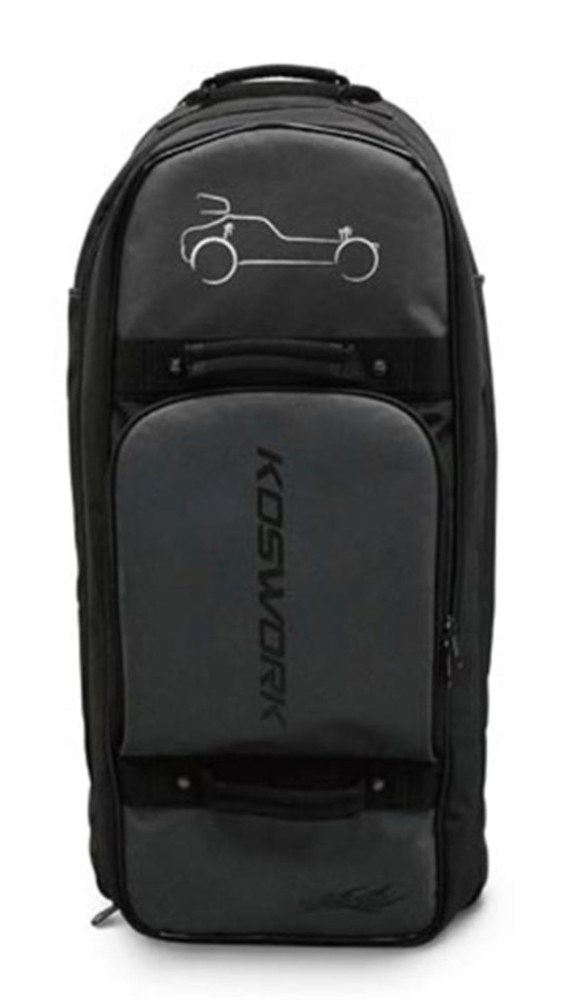 Koswork 1/8 Rolling Pit Bag. Excellent for travel, sport and various RC racing purposes! It keeps you organized through the racing trips and plane rides and is a great rolling luggage bag at an affordable price! Features a large lid opening for easy and quick access to all gear compartments, two attachable dividers for fine allocation, two elastic strips for you to hold things well, several zipper pockets and oversized wheels to travel with ease through most terrains!