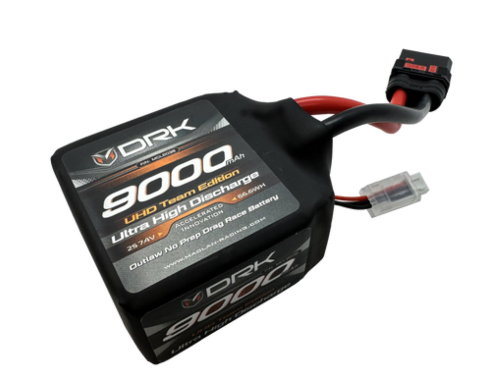 This is DRK 9000mAh UHD (Ultra High Discharge) Team Edition Drag Race Battery. It is designed with the latest formula with ultra high discharge cells. It will provide the optimum voltage retention to the weight ratio in the outlaw NPRC.