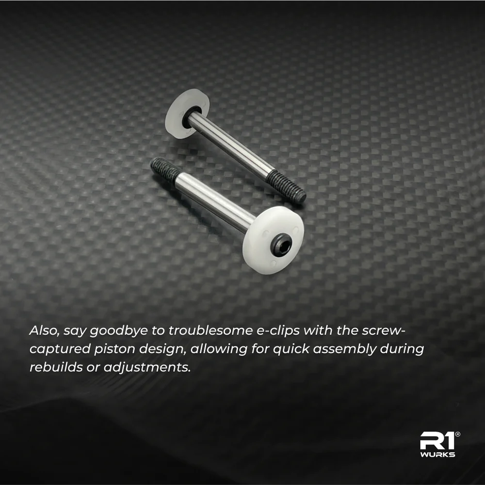 Upgrade your V1 shock internals with precision-machined polyacetal components, a high-stiffness, low-friction thermoplastic with excellent dimensional stability. These parts have been machined with tighter tolerances compared to the standard components. Also, say goodbye to troublesome e-clips with the screw-captured piston design, allowing for quick assembly during rebuilds or adjustments.