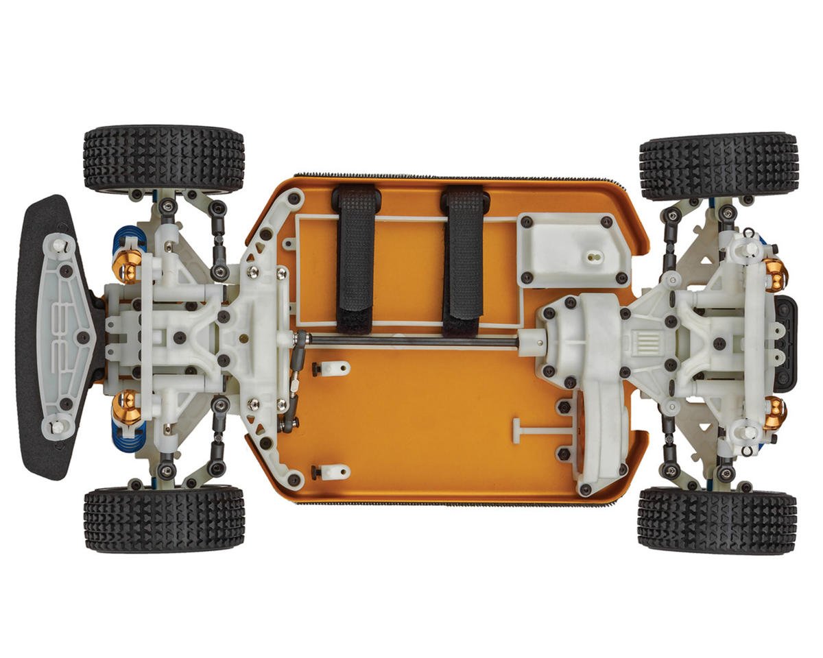 Experience the golden era of RC racing reimagined with this rally-inspired machine, featuring a gold-anodized aluminum tub chassis and classic RC10 livery decals. The clear three-piece rally body, complete with rear bumper and wing, combines aggressive styling with aerodynamic function, while molded brake calipers and rotors deliver authentic scale detail. With redesigned rally shock towers, gold aluminum shocks, and an adjustable front suspension equipped with upgraded upper arms and turnbuckles, this car is built for precise handling and all-surface domination.